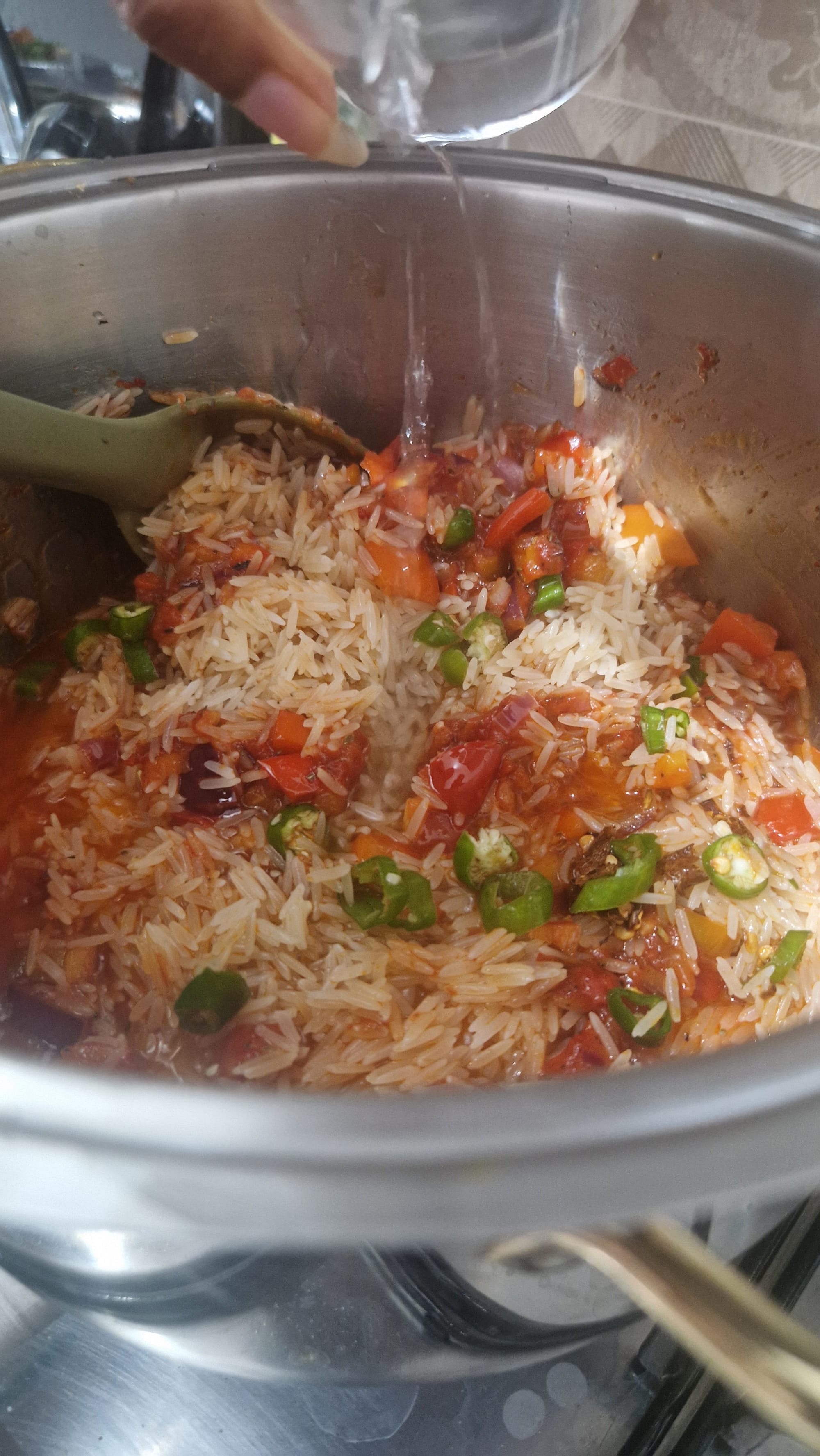 - Add the rice: Pour in the pre-washed rice and chicken stock (or water). Stir well to combine and let it cook on medium heat.