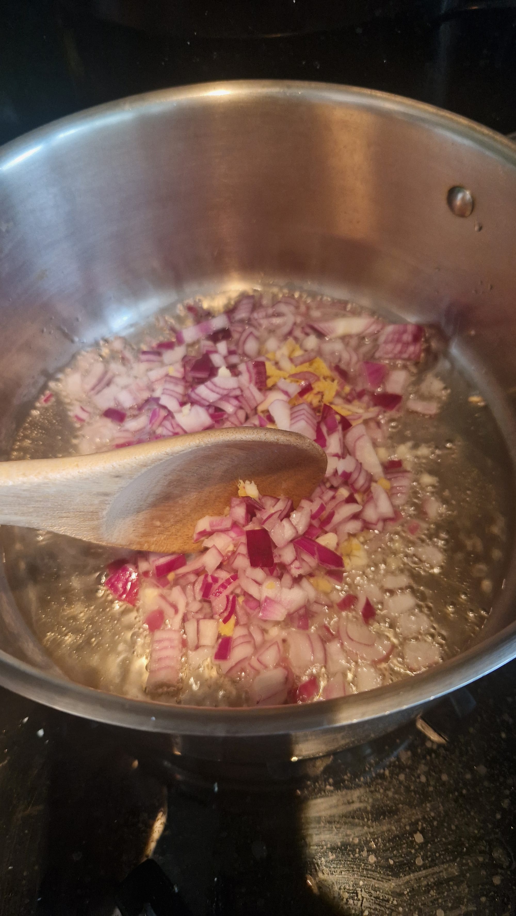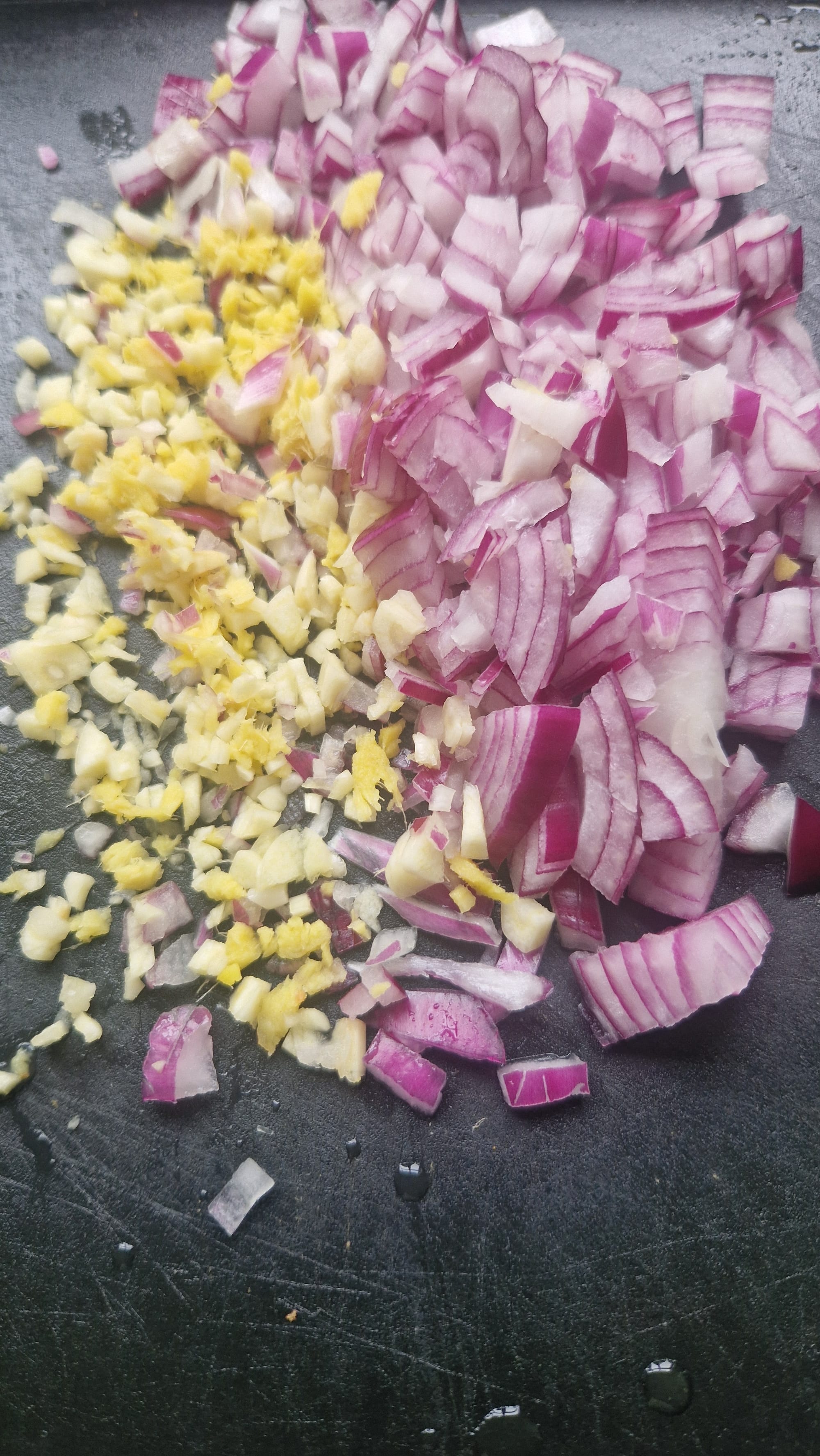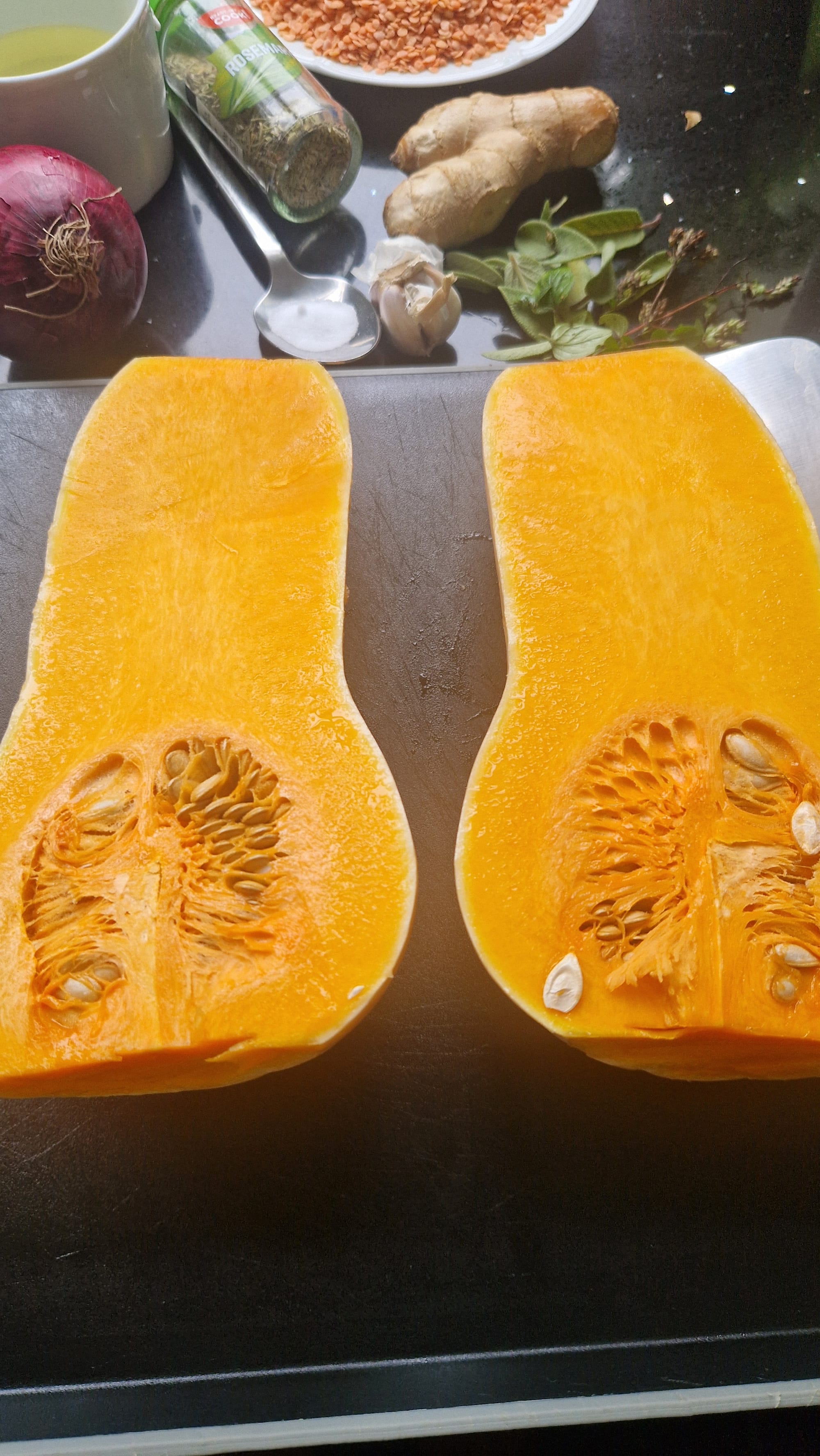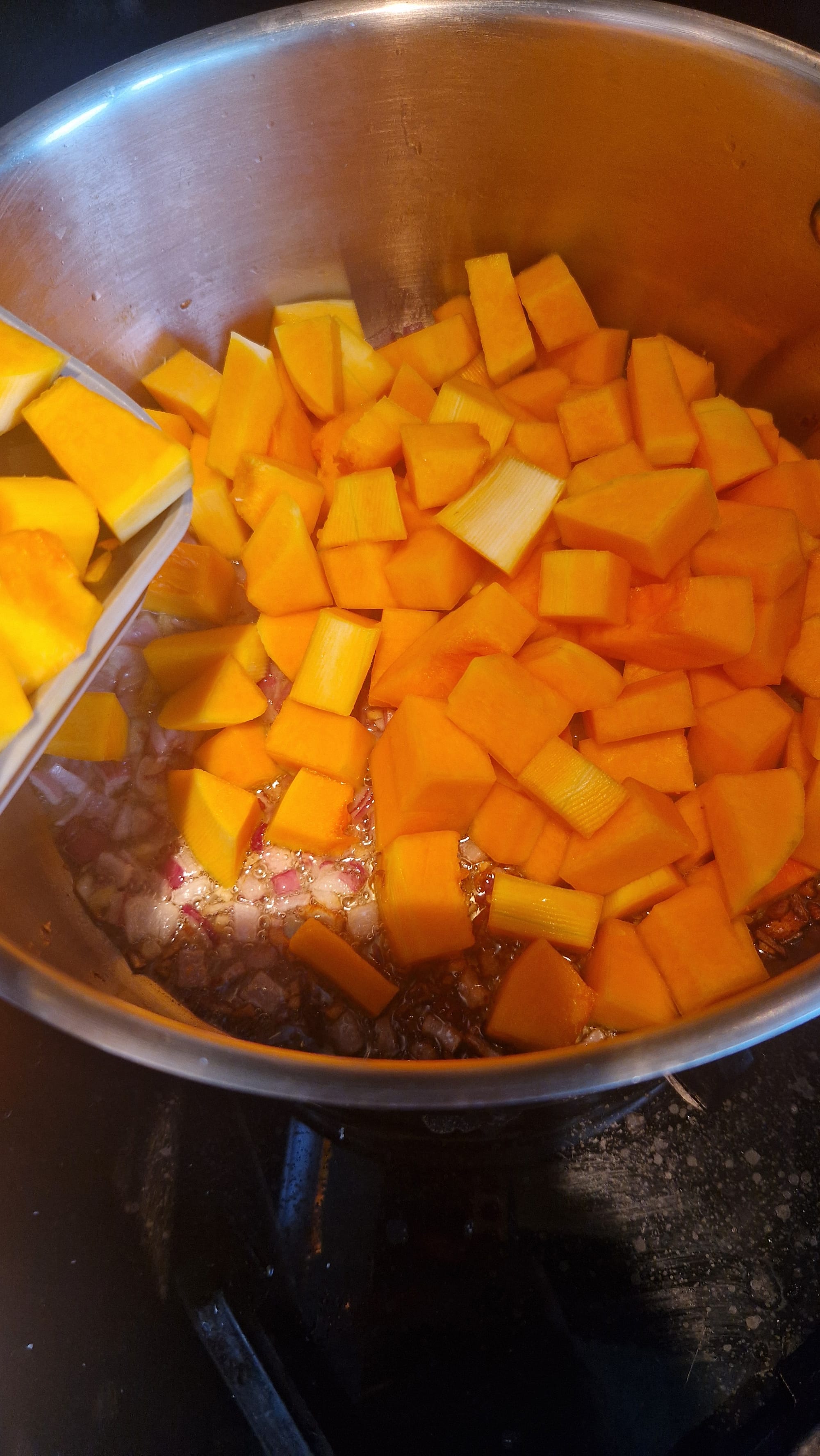Chop the butternut squash into small cubes. Dice the onions, garlic, and ginger.