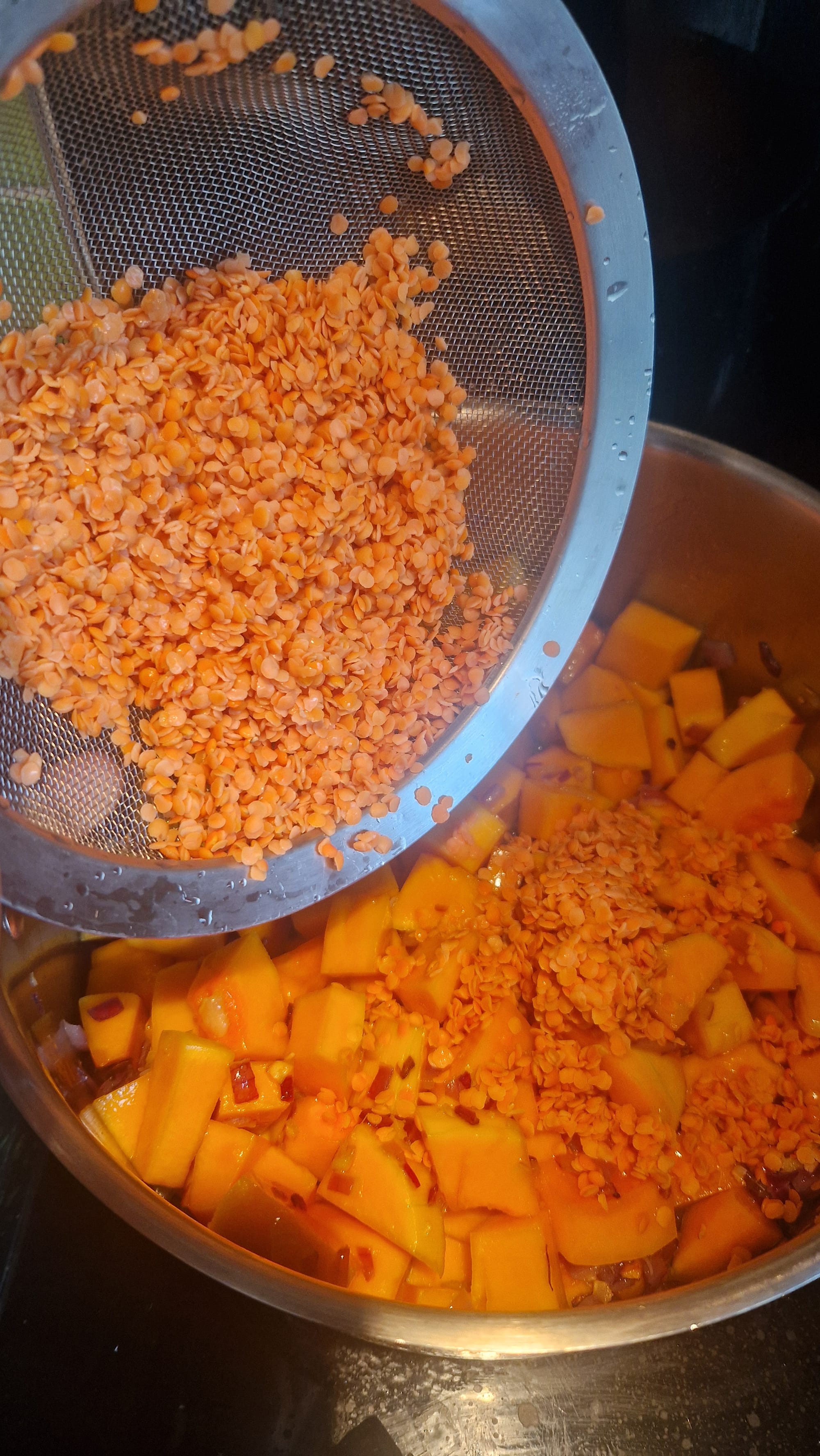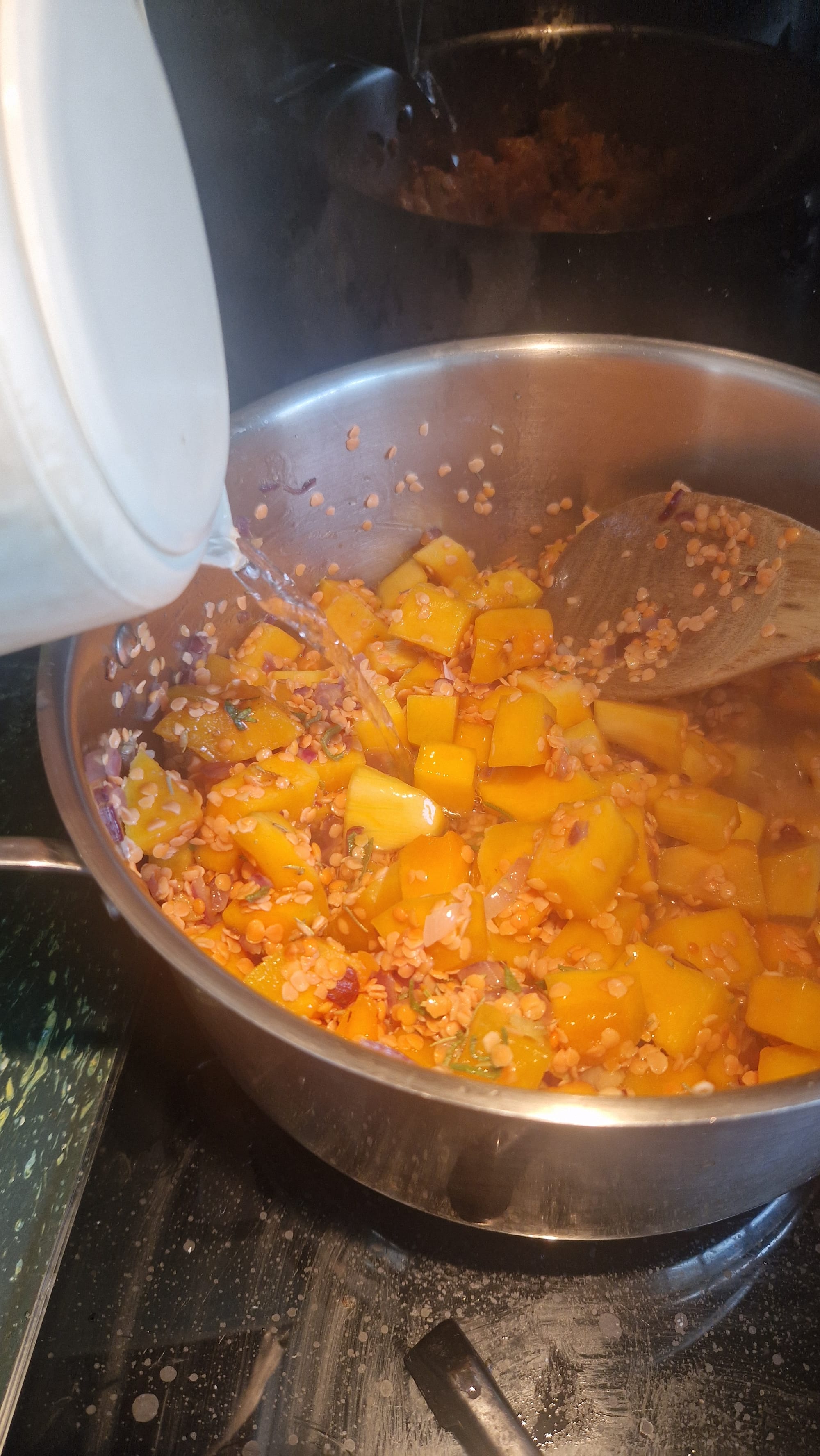 Pour in enough water or vegetable stock to cover the vegetables. Bring to a gentle boil, then reduce the heat and let it simmer until the squash and lentils (if using) are soft — about 20 minutes.