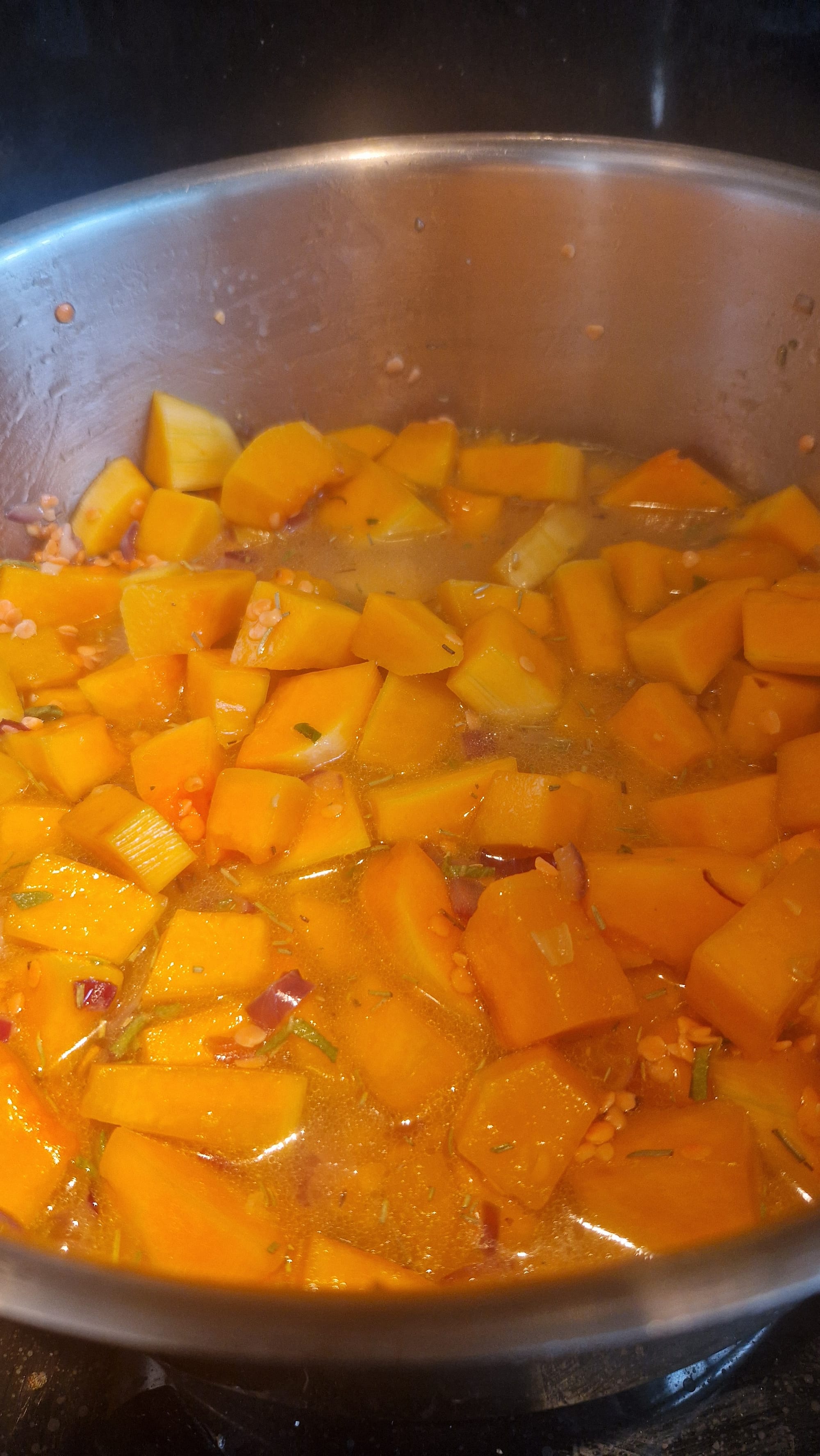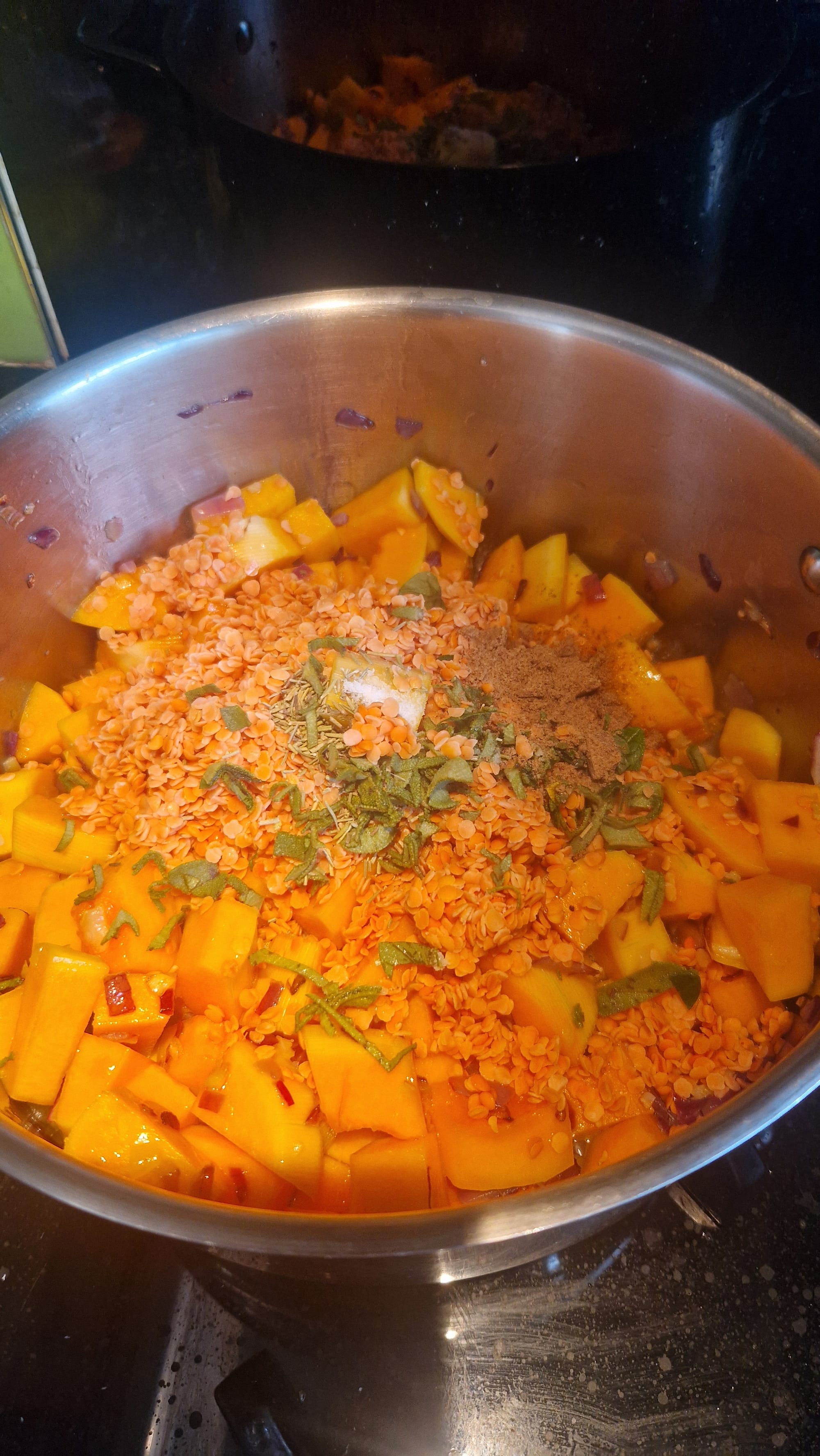 Stir in the chopped butternut squash, lentils (optional) and herbs. Season with salt and pepper.