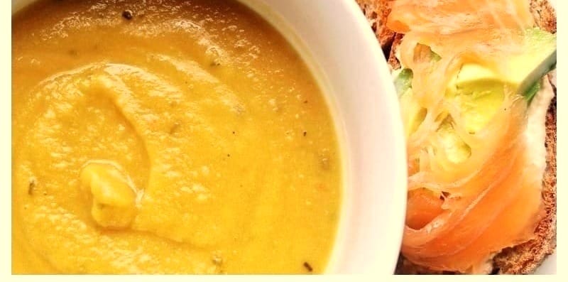 Serve your butternut squash soup warm, with a side of toasted bread. In this recipe, I paired my soup with toasted sour dough bread topped with hummus, avocado slices and smoked salmon.